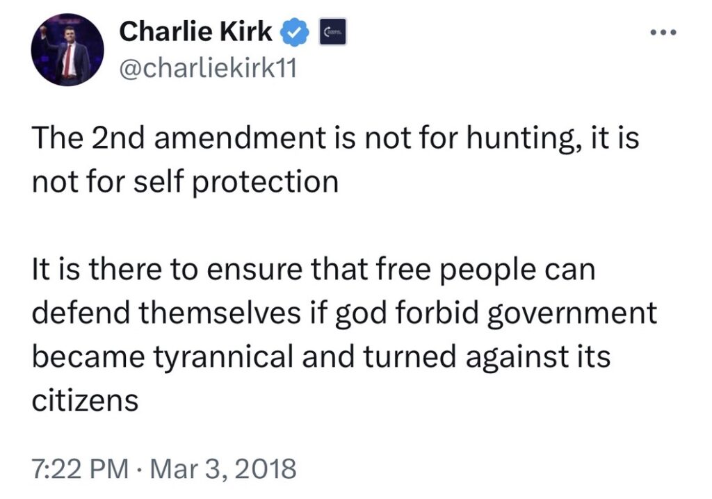 “I think it’s worth it. It’s worth to have a cost of, unfortunately, some gun deaths every single year so that we can have the Second Amendment to protect our other God-given rights.” ~Charlie Kirk