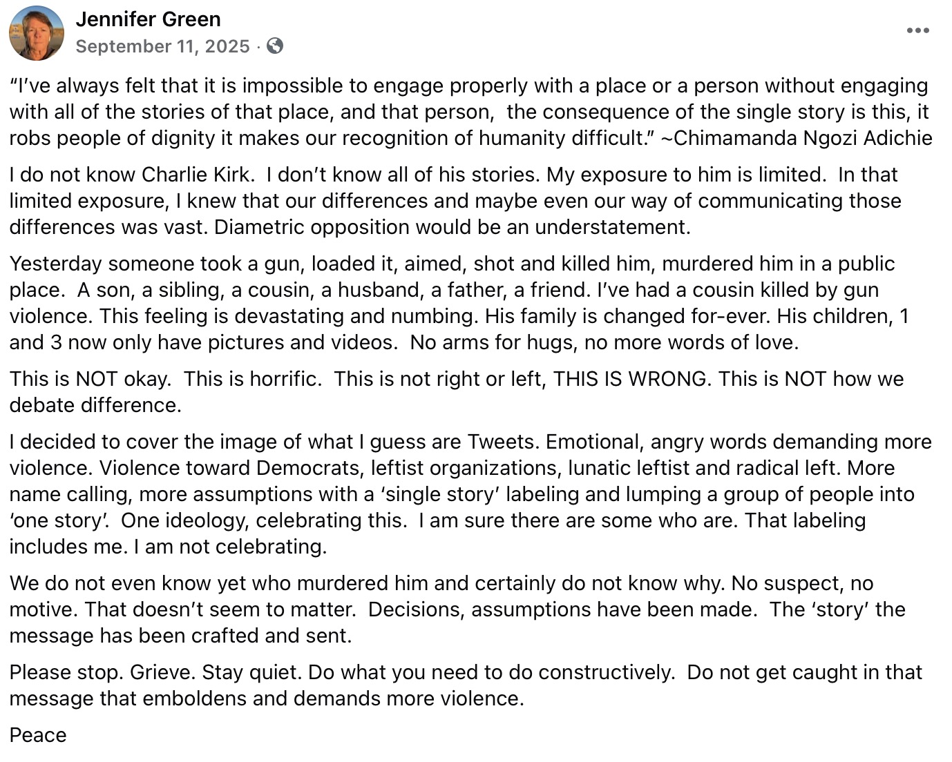 I decided to cover the image of what I guess are Tweets. Emotional, angry words demanding more violence. Violence toward Democrats, leftist organizations, lunatic leftist and radical left. More name calling, more assumptions with a ‘single story’ labeling a group of people, that includes me as celebrating this. I am sure there are some who are. I am not.”